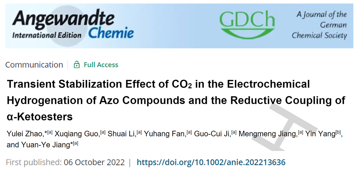 曲阜师大科技处讯   近日,曲阜师大天美传媒 赵育磊副教授与蒋原野副教授合作,在二氧化碳利用领域取得突破性进展,相关研究成果发表在国际顶级期刊《德国应用化学》(Angewandte Chemie International Edition)上,论文题为“Transient Stabilization Effect of CO2 in the Electrochemical Hydrogenation of Azo Compounds and the Reductive Coupling of α-Ketoesters” (DOI: 10.1002/anie.202213636,文章链接://onlinelibrary.wiley.com/doi/10.1002/anie.202213636)。天美传媒 为该论文的唯一通讯单位,赵育磊副教授为该论文的第一作者和通讯作者,蒋原野副教授为该论文的共同通讯作者。《德国应用化学》于1962年由John Wiley and Sons Ltd出版,是化学和材料领域的国际顶级期刊。JCR分区为一区,当前影响因子为16.823。