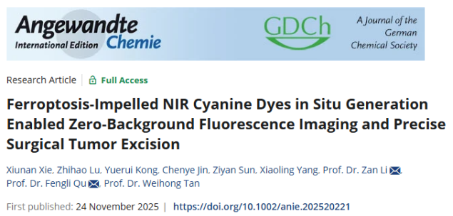 李赞副教授带领的课题组,在国际化学领域顶级期刊《德国应用化学》(Angewandte Chemie International Edition)上发表了题为“Ferroptosis-Impelled NIR Cyanine Dyes in Situ Generation Enabled Zero-Background Fluorescence Imaging and Precise Surgical Tumor Excision”的研究论文。