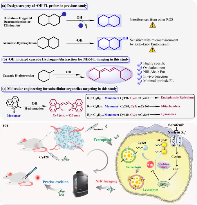 针对这一关键科学问题,李赞课题组创新性地提出一种“零背景”荧光成像策略,用于精确量化和评估索拉非尼诱导的铁死亡肿瘤中的羟基自由基(•OH)水平。该研究巧妙利用肿瘤铁死亡过程中产生的内源性•OH作为生物催化剂,触发单体(Cy420)的异质二聚化,直接在病灶原位生成近红外(NIR)发光的花菁染料(mCy849)。研究设计合成的十八烷基取代单体(Cy420)在血清白蛋白调控下,可发生从环状到方形纳米组装体的形态转变,并借助增强渗透保留效应(EPR)实现靶向性、长效性的肿瘤部位滞留。该策略的核心优势在于,原位生成的NIR染料(mCy849)通过其疏水性双十八烷基链驱动的自组装形成有效的屏蔽效应,从而显著抵抗分子氧化,确保荧光定量分析的准确性。