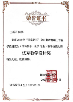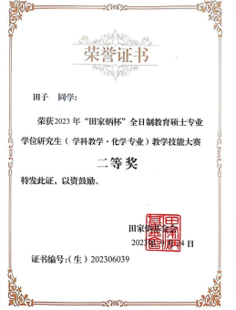 2021级学科教学(化学)专业的田子同学及2022级学科教学(化学)专业的王新月同学参加了此次决赛,分别获得了全国二等奖和优秀教学设计奖的好成绩。这是我院学子继在前几届比赛中获得佳绩后的又一次出色表现。与此同时,天美传媒