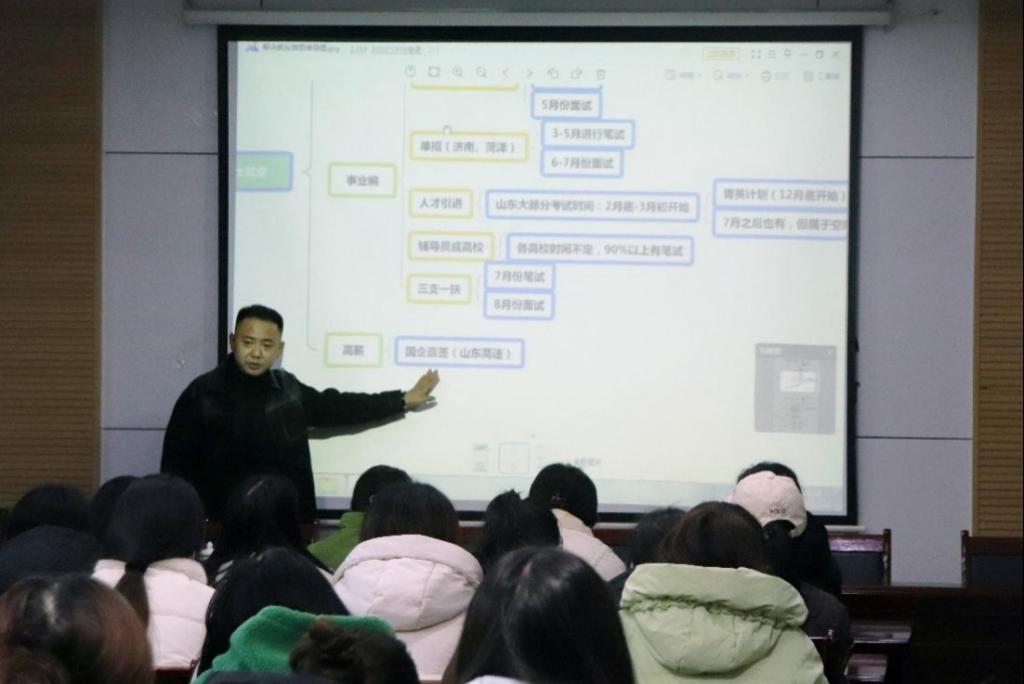 培训会上,孔腾校长为毕业生做了题为《解决“就业难”——如何实现高质量就业?》的培训报告,孔校长从公务员系统、事业编制和高薪企业等3类岗位类别,分别详细讲述每个岗位类别的招聘时间、岗位要求和应聘流程,为在场的毕业生规划了一条清晰的就业时间轴,勾画出了一副清晰的就业路线图,并结合自己多年的从业经验,就公职类考试形势和各地相关政策做了全面的分析。互动交流环节,针对毕业生存在的就业困惑,孔校长一一做详细的解答。最后,辅导员李坤对本次会议进行总结,一要提前规划职业生涯,奠定就业基础;二要客观评估自身能力,明确择业标准;三要掌握法律常识,增强法律意识。此次,让毕业生更清楚地认清未来就业的方向,明确未来的就业目标。