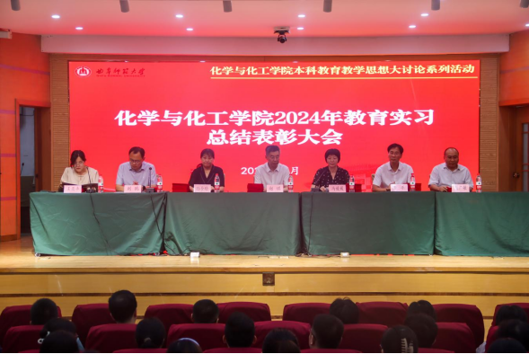 在孔子会堂召开2024年教育实习总结表彰大会,学院党委书记赵琪、院长冯媛媛、党委副书记孙金玲、副院长李平、副院长刘鹏、全体实习指导老师、2021级化学专业(含公费师范生)全体学生参加会议,会议由学院团委书记王亚平主持。