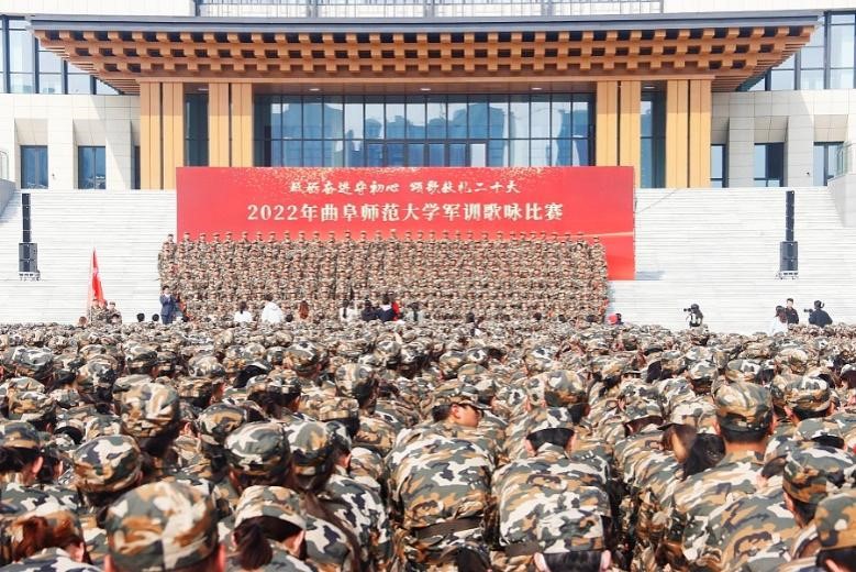 2022年军训歌咏比赛在西校区图书馆前隆重举行。天美传媒