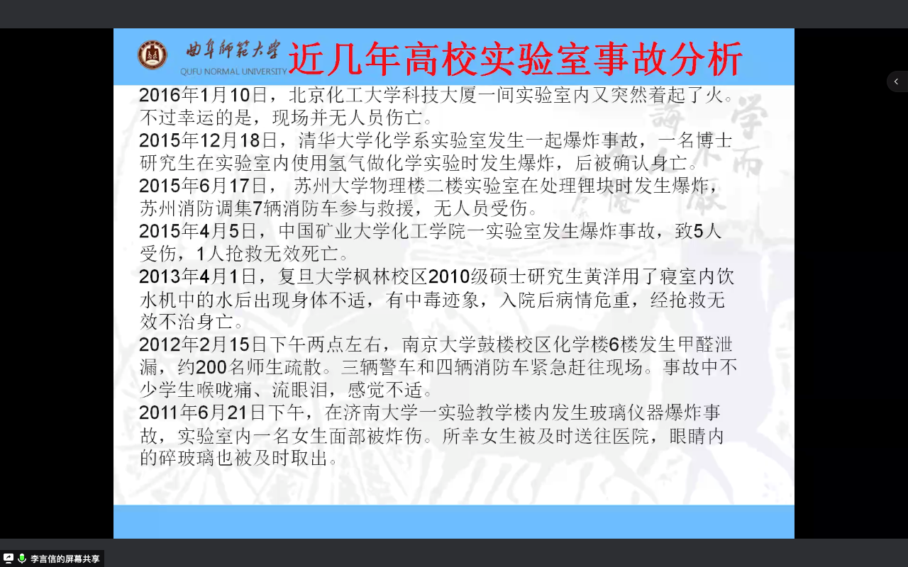 会议伊始,李言信强调正式实验之前要进行实验室三级安全培训,列举了近几年高校实验室事故案例,指出实验室安全的重要性。随后,他从“防范为主,警钟长鸣”、“事故救治,正确冷静”、“紧急避险”,珍爱生命“三个方面详细举例,介绍了实验安全的培训内容。同学们在评论区积极响应,本次会议达到高潮。随后,他强调安全意识是实验室安全的关键,防患于未然是最重要的,并且送给学生一句话:态度决定一切,细节决定成败。最后,田子对此会议进行总结,要求同学们严格遵守实验室规则,提高安全意识。