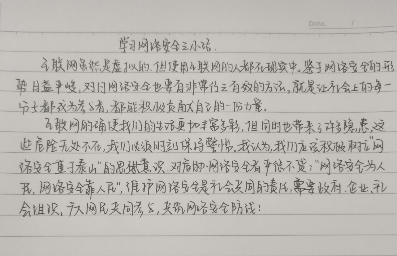 作为一名当代大学生,我们必须加强网络安全学习,提高安全和责任意识,对自己在网络中的言论和行为负责,对身边的人负责,对社会、国家和民族负责。我们在使⽤⽹络时,⼀定要⼩⼼谨慎,不随意浏览恶意网站,不随意发表言论,坚守网络道德,不做“键盘侠”。同时,我们更应深刻感悟新时代国家安全成就,进一步树牢总体国家安全观和正确的网络安全观,不断提升网络安全意识,维护国家网络安全,为社会培育一片网络净土。
