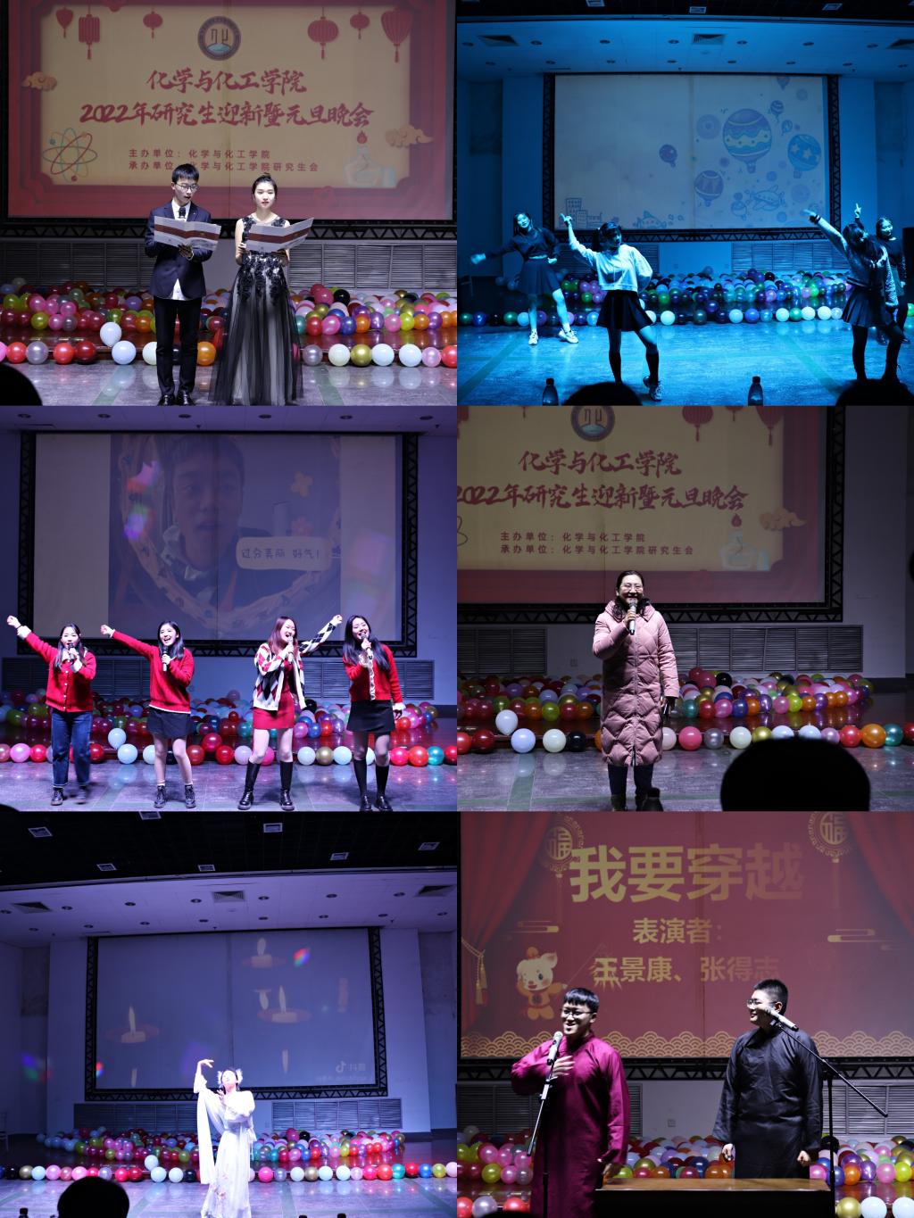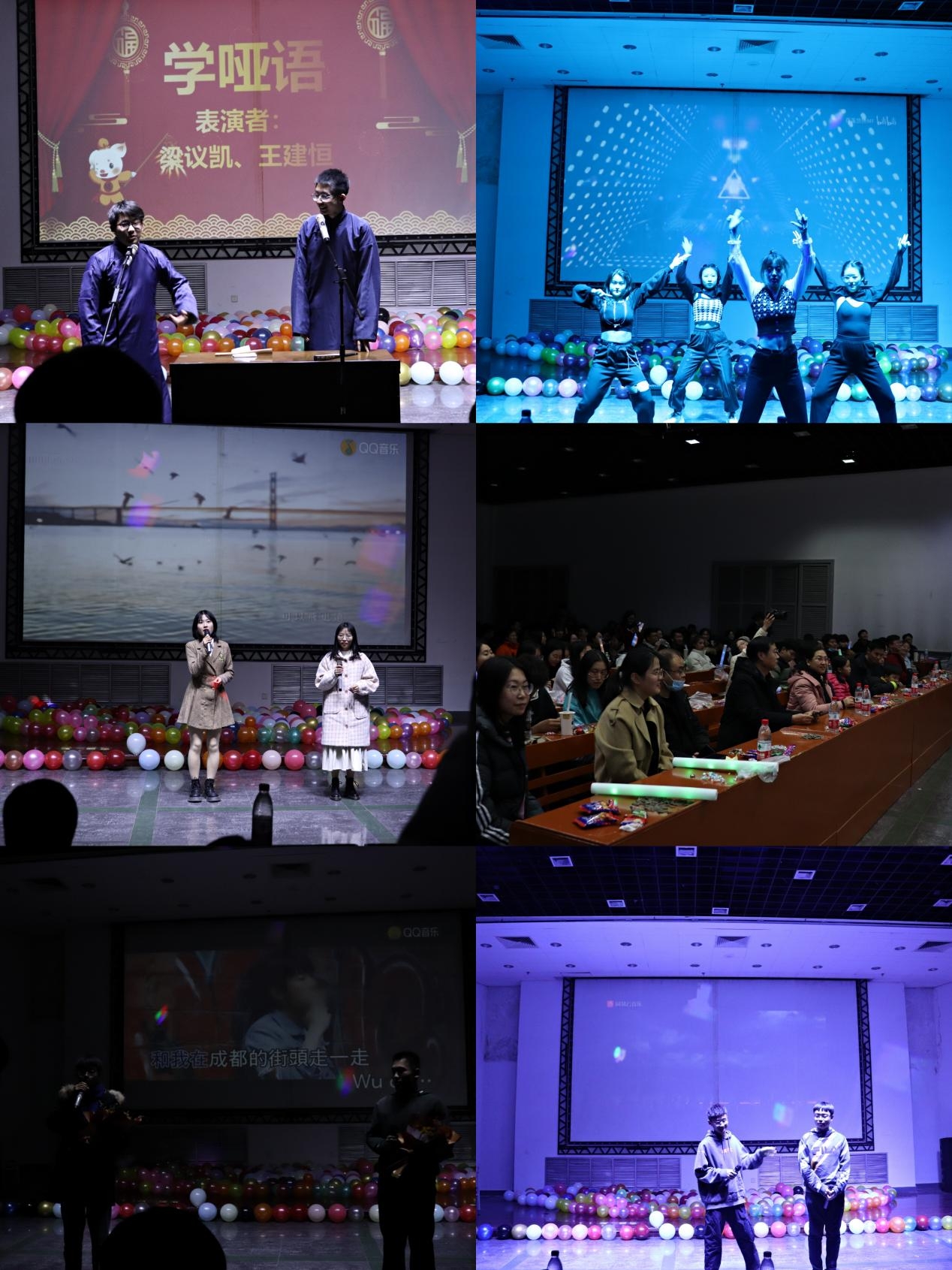 晚会一开始,充满活力、激情四射的开场舞《舞蹈串烧》瞬间点燃了现场的气氛;随后,王婷带来的古典舞《幻尘》以曼妙的舞姿、悦耳的音乐,将古典风采展现的淋漓尽致;张得志、王景康带来的相声《我要穿越》风趣幽默,可谓妙语解颐;由李炜钰,李艳宇带来的钢琴演奏《大鱼》唯美动人、含商咀徽;当激情的音乐缓缓响起,劲舞《16 shots》让人感受到了劲舞的独特魅力,现场观众的掌声、欢呼声、尖叫声将晚会推向高潮;晚会的重头戏是由2021级班委们带来的《歌曲串烧》,动感的歌声展现了班委的新风貌。晚会最后,2021级研究生班长曲城铭作为代表进行讲话,为本次元旦晚会画上了圆满的句号。