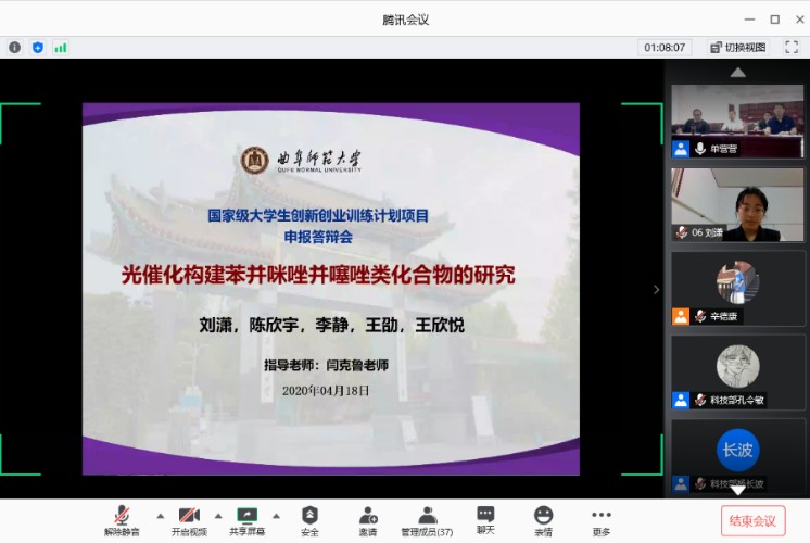 受疫情影响,本次答辩会议通过视频连麦和屏幕共享的线上方式举行。答辩现场,各位项目主负责人按抽签顺序开始轮流有序答辩,他们准备充分,思路清晰,语言流畅。各答辩人分别从项目背景、理论价值、实际应用价值、实施方案、预算、团队优势等多个不同方面出发,展开论述,短短的五分钟内将自己团队的训练计划项目简洁清晰地介绍给评审老师。展现出化院学生从容自信的临场发挥水平和优秀创新研究能力。现场评审老师们细心指导部门学生组织活动,认真倾听同学们的项目报告,严格规范地按照评分规则进行打分。其余候场同学皆在耐心等候的同时,或积极准备,或认真观摩学习。整场会议秩序井然有序,节奏紧凑适当,内容精彩纷呈,学术氛围浓厚。