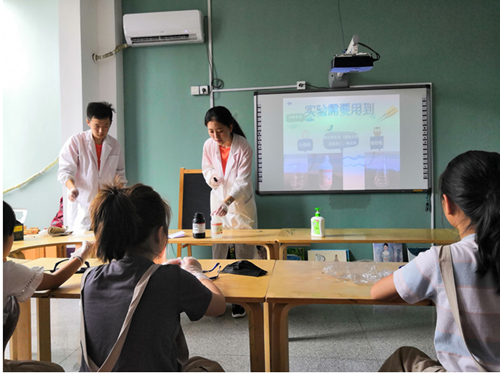 第一堂课是由小组成员牛子文和宋熙童完成的,他们用科学严谨的实验态度、饱满的热情向小朋友们传授知识。在课堂上,小朋友们积极回答问题,同时也不断提出自己的小问题,两位小组成员也耐心的回复她们的提问。通过小组成员在课堂上的实验展示,小朋友们充分展现了对实验的强烈兴趣。
