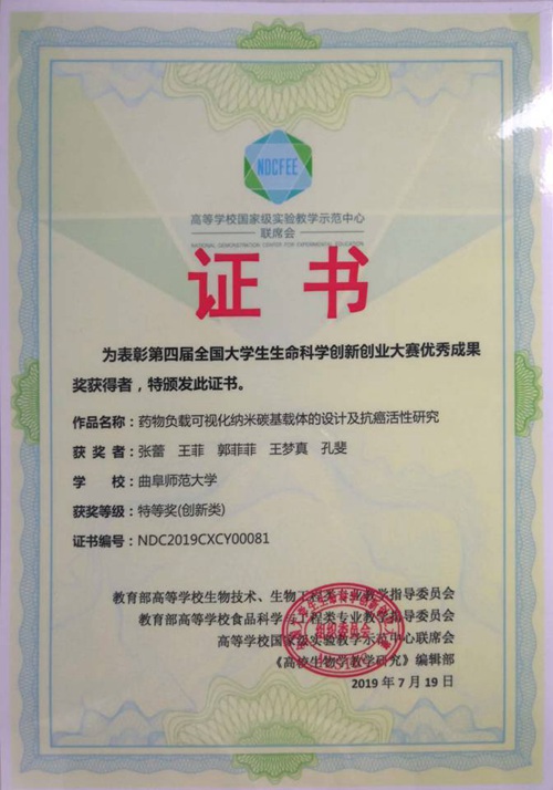 大赛最终评出全国特等奖38项,其中选出4项在颁奖大会面向全国专家和师生路演。公培伟老师指导的项目(项目名称:药物负载可视化纳米碳基载体的设计及抗癌活性研究,项目成员:张蕾,王菲,郭菲菲,王梦真,孔斐)获得全国特等奖,该项目被大会组委会选出进行路演汇报,获得参会专家、老师和学生一致好评。