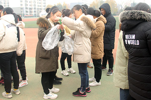 本次活动共分为热身活动、环保志愿书签字、趣味挑战和拾荒慢跑四个环节。主持人介绍规则后,活动正式拉开序幕。在热身活动游戏中十五组参赛人员配合默契,顺利完成挑战。经历了“心有千千结”和“叠报纸”环节的预热后,活动进行到白热化阶段。各组参赛人员进行环校跑活动,随手捡拾校园中的垃圾,同时积极向路人宣传环保知识,并呼吁路人在环保倡议书上签字。通过趣味挑战,让更多人了解这次活动,也让更多人加入到环保的队伍中来。比赛结束后,志愿服务部成员对每组成果进行点评,并评选出一等奖一组、二等奖两组、三等奖两组、优秀奖三组。