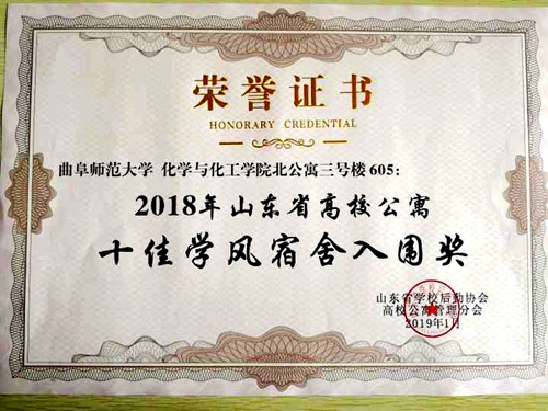 北公寓东区三号楼605宿舍荣获“2018年山东省高校公寓十佳学风宿舍入围奖”。