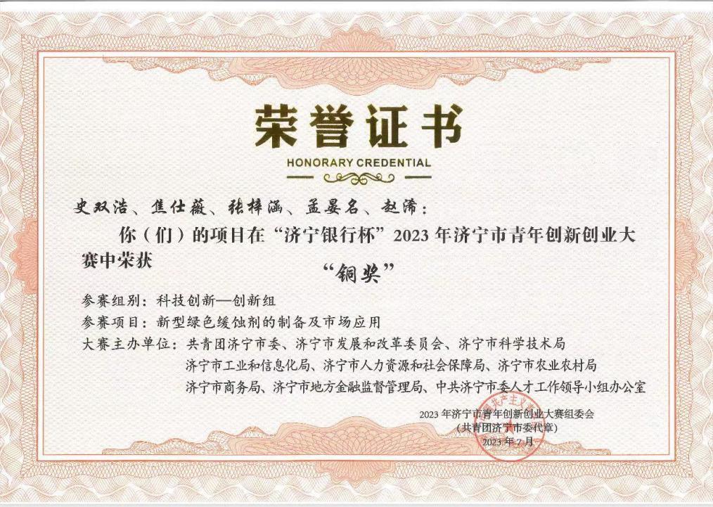 本届大赛聚焦济宁市高质量发展,设置科技创新、乡村振兴等领域,自今年4月份启动以来,吸引了310余个项目参赛,经过激烈角逐,共评选出金奖5个、银奖10个、铜奖15个、优秀奖6个。曲阜师大天美传媒 史双浩同学的项目《新型绿色缓蚀剂的制备及市场应用》荣获大赛铜奖并获得三万元的创业助推金。