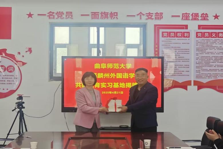 图为学院党委书记赵琪和菏泽麟州外国语学校校长刘明强共同为教育实习基地揭牌