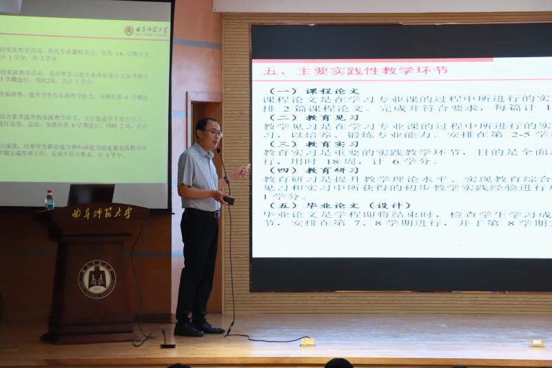 大会以“精准解读培养方案、靶向指引学业方向”为核心,为不同专业新生量身定制引导内容,让“专业认知”更具体、“规划方向”更清晰。副院长刘鹏聚焦化学(师范)专业,以培养方案为蓝本,系统阐释该专业 “师德、知识、能力、素养” 四位一体的培养目标 —— 既强调师德师风对未来教育工作者的核心引领作用,也详解化学学科理论知识与教育学专业课程的融合逻辑;同时,他还结合教育见习、教育实习、教学研习等全链条实践教学环节,生动展现师范专业 “理论 + 实践” 的培养特色,让新生对未来职业发展有了更具象的认知。