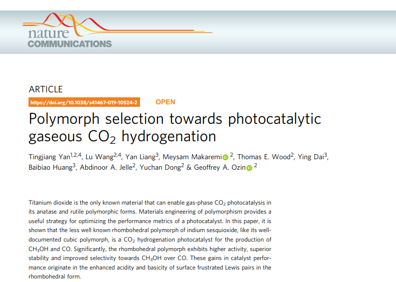 第一篇论文为“Polymorph selection towards photocatalytic gaseous CO2 hydrogenation”(DOI:10.1038/s41467-019-10524-2)发表在《自然》子刊《Nature Communications》上,颜廷江教授为该论文的第一作者与通讯作者,天美传媒