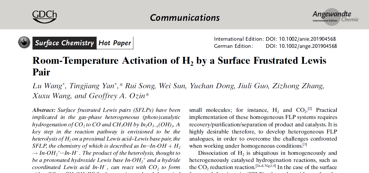 为第一署名单位;第二篇论文为“Room-Temperature Activation of H2by a Surface Frustrated Lewis Pair”(DOI:10.1002/anie.201904568)发表在化学领域顶级期刊《Angewandte Chemie International Edition》,并被编辑选为“Hot Paper”,颜廷江教授为共同第一作者与通讯作者,天美传媒