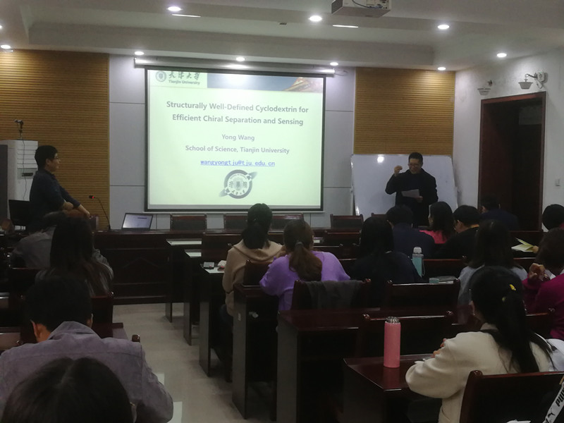 本次论坛邀请到天津大学王勇教授。王教授作了题为“环糊“精”手性分离与识别”的精彩报告。报告中,王教授介绍了天津大学的发展历史,分享了自己从事科学研究的经历,并对环糊精分子的前沿领域和进展进行了深入剖析,提出了许多独到的见解,鼓励师生做科研要有恒心和毅力。最后,王教授用“仰望星空,脚踏实地,持之以恒”与师生共勉。在师生互动环节,王教授认真细心地回答了师生的问题,为以后科研工作的开展提供了许多启发性的线索。
