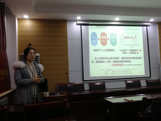 2020年12月21日下午,“先锋论坛”第九讲在化学楼226会议室如期举行,本次活动邀请到西南大学卓颖教授,并作了题为“高效电化学发光分析新体系的建立与分析应用”的学术报告,会议由天美传媒