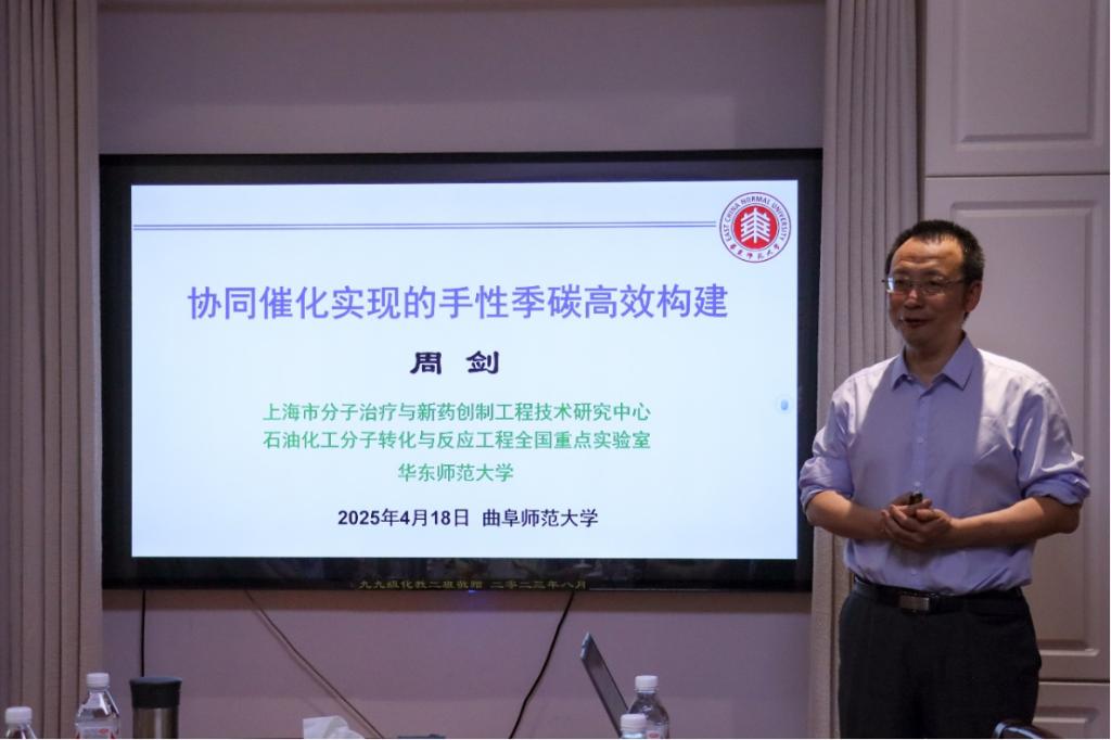 为进一步加强学术交流,特邀华东师范大学化学与分子工程学院周剑教授、刘路教授、周锋教授三位杰出学者进行了系列专题学术报告。报告于4月18日,在化学楼209会议室进行,聚焦手性合成、卡宾化学与二氧化碳转化等前沿领域。本次报告由天美传媒