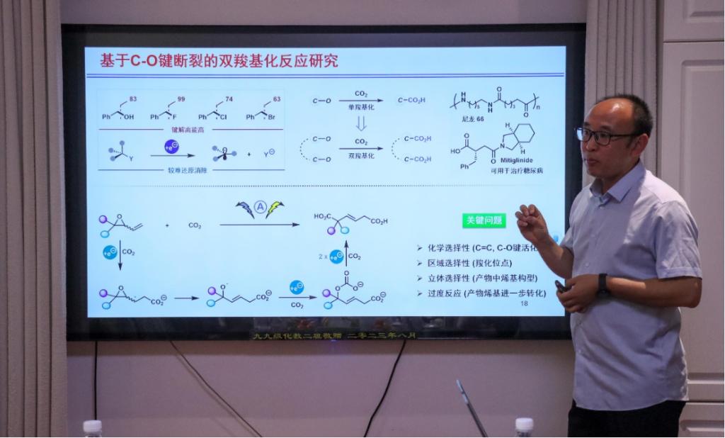 周锋教授分享了其团队在二氧化碳高选择性转化研究方面的最新进展。报告详细介绍了其基于电化学和协同催化等策略,探索二氧化碳参与高选择性反应,以实现羧酸或手性杂环化合物的多样性、高效、高立体选择性合成的系列工作。