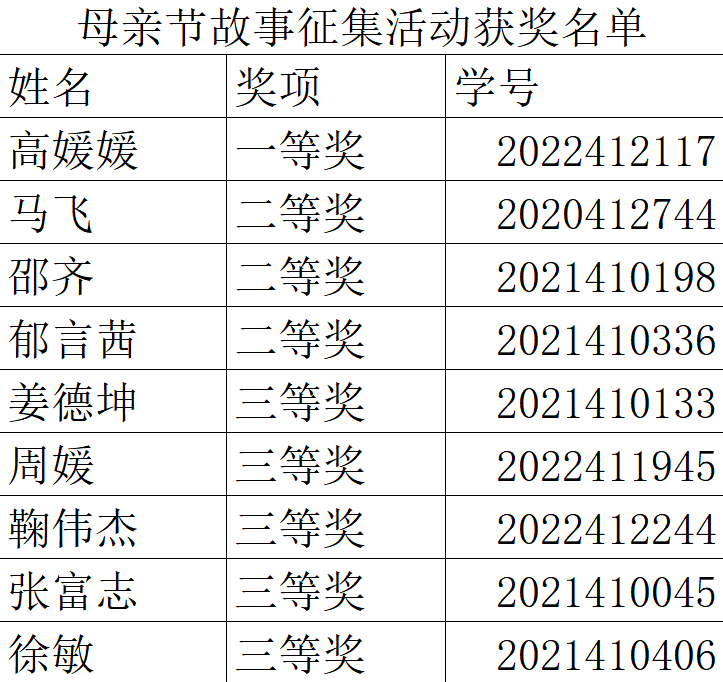 图为“母爱如雨,润物无声”活动获奖名单