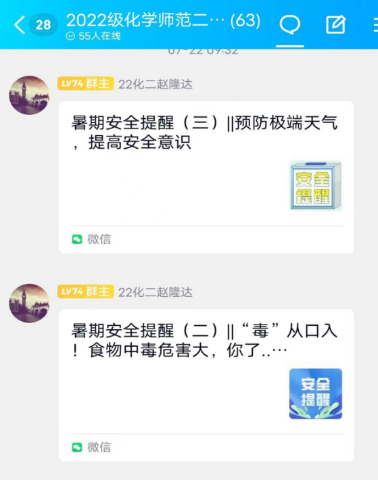 此次活动围绕提高学生暑假安全防范意识为目的而展开,通过班级群提醒、公众号推文等形式,全面开展防溺水、防诈骗、防邪教、防食物中毒、防交通事故、防极端天气等内容的安全教育,教育学生不去陌生水域游泳,不随意刷单或扫码,不参与邪教组织,不吃生冷变质食物,外出遵守交通规则,骑电动车要戴头盔,极端天气不外出,男生不酗酒、不打架等等,不断提升学生暑假安全防范意识,自觉远离各种危险。通过暑假安全教育知识宣传,以及安全注意事项提醒,增强了同学们的安全防范意识,为安全快乐地度过暑假提供了有力的保障。