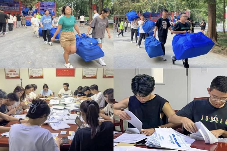 图为新生报到并领取新生大礼包