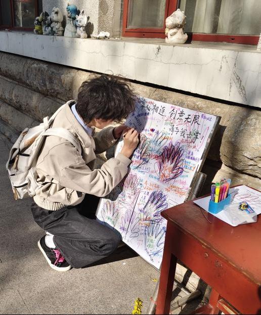 本次活动中,学生们积极参与,手绘手掌轮廓并写下寄语,形成一个富有意义的手掌链,学生们之间传递彼此的鼓励与美好憧憬,共同感受温暖与蓬勃向上的力量。