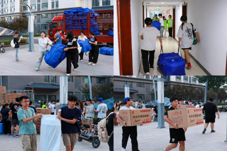 宿舍管理部在校内公寓一号楼和西公寓一号楼组织志愿者搬运新生被褥、盆子和暖壶,2025级新生辅导员王亚平、曾川亲临现场指导工作。