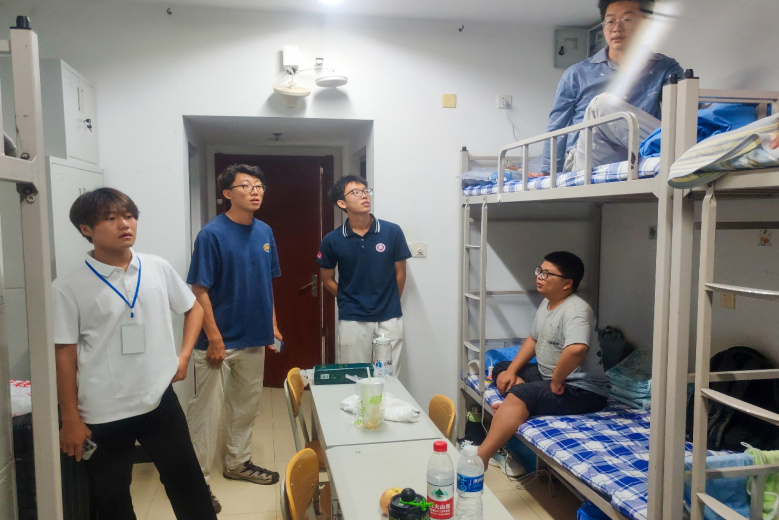 图为学长辅导员走访男生宿舍