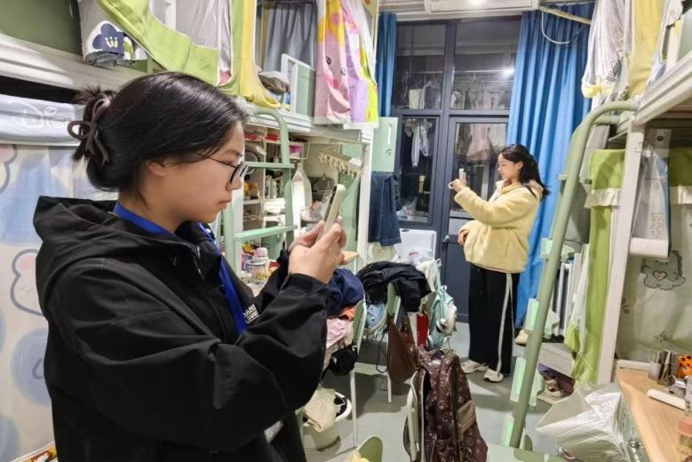 图为党员学生干部检查宿舍安全