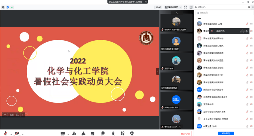 召开2022年暑期大学生社会实践线上动员大会。学院团委书记王亚平出席本次会议。会议面向各社会实践队队长及青年志愿实践部全体成员召开。本次会议由青年志愿实践部干事王影主持。